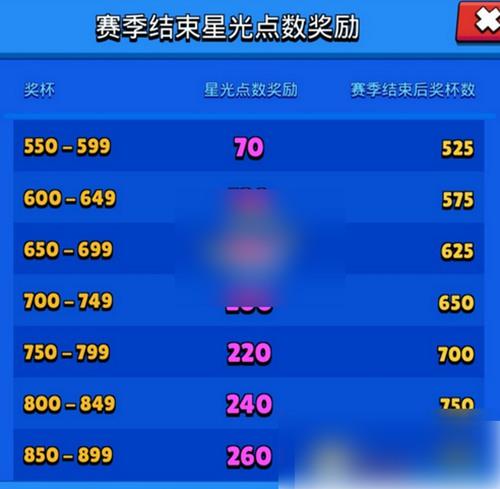 1.赛季英雄分段结算,每个赛季结束后,会根据奖杯的数量,来结算星光点数奖励,各个奖杯阶段的奖励表如下:
