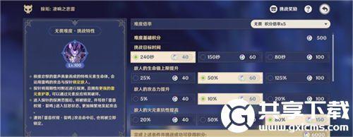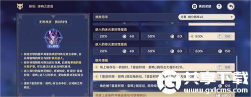 1.原神除垢凄响之悲雷先选择积分倍率x5,其它挑战难度如图选择就行。正常练度的话,时间选择150秒也是够的,分数还能更高,不过反正也满6000分了,直接选择240秒躺平打完。