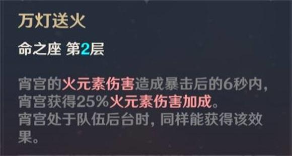 一个提升不错的命座,一般情况下宵宫的暴击率在70%以上,该命座的触发非常便捷,整体提升不错,至少比某些角色命座只加15%高太多了,不同情况下宵宫增伤区波动很大,整体提升约在10%。