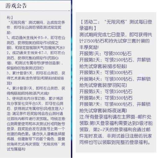 测试期间完成七日登录,即可获得共计21500钻石和抢先试穿三套时装的丰厚奖励!