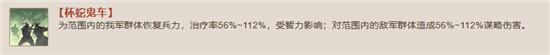 为范围内的我军群体恢复兵力,治疗率56%~112%,受智力影响;对范围内的敌军群体造成56%~112%谋略伤害。