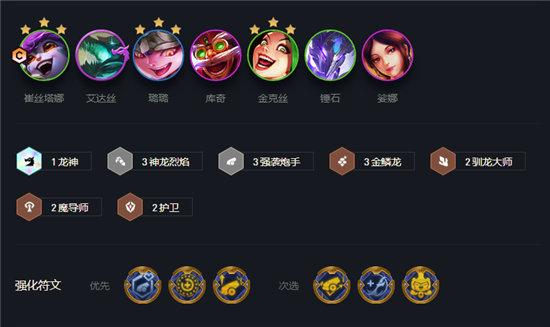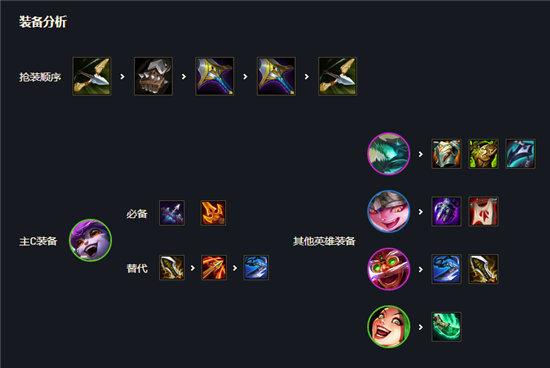 小炮必备轻语,第二件无尽/杀人剑、巨杀都行,第三件羊刀/飓风/饮血,怕控制也可以做水银。前排金龙推荐狂徒+石像鬼板甲,有其它肉装仍上去就好。青龙刀金克斯三星就给金克斯,露露三星就给露露,有多余的物理输出装就给飞机,两星飞机也能打出很高的伤害。其它多余的装备攻速旗伏击可以给露露提升小炮的输出。