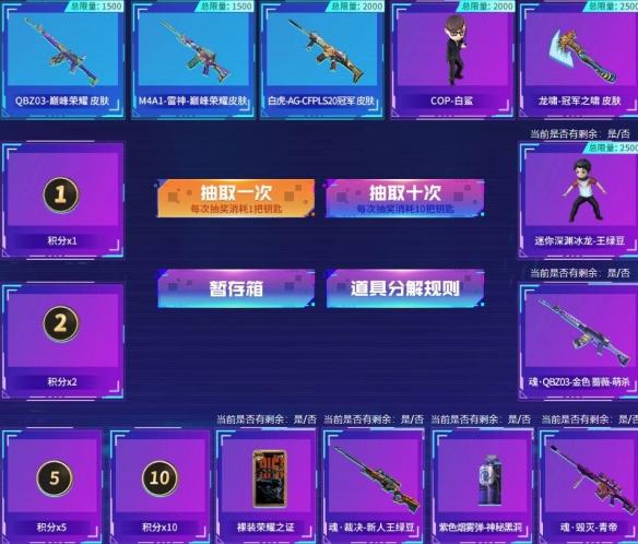 2、本次活动限定大奖为OBZ03-巅峰荣耀皮肤、M4A1-雷神-巅峰荣耀皮肤|、白虎-AG-CFPLS20冠军皮肤、COP-白鲨、龙啸-冠军之啸皮肤。