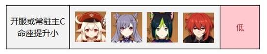 这四为主C详细大家都不陌生,其中开服1.0版本可莉就有的主C,另外三位都是常驻主C。这些主C角色的强度相对来说没有其他的那么高,并且命座提升也比较小。
