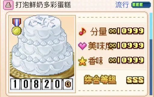 创意蛋糕店打泡鲜奶多彩蛋糕怎么制作?打泡鲜奶多彩蛋糕在创意蛋糕店里分量一万零九百九十九,美味度一万零九百九十九,香味一万零九百九十九,综合SSS,一共一万零八百二十克,这个配方卡路里很容易爆,之前我有用强化素材降低过食材的卡路里,猕猴桃的卡路里134,巧克力喷剂卡路里145,打泡鲜奶卡路里360,是不是已经迫不及待看看打泡鲜奶多彩蛋糕的制作方法了,不要着急,下面卟扒小编马上给小伙伴们带来一份创意蛋糕店打泡鲜奶多彩蛋糕食谱配方攻略,需要的小伙伴可以参考看看,更多创意蛋糕店食谱配方可以到底部的相关文章栏目查询,有用就收藏下来吧!