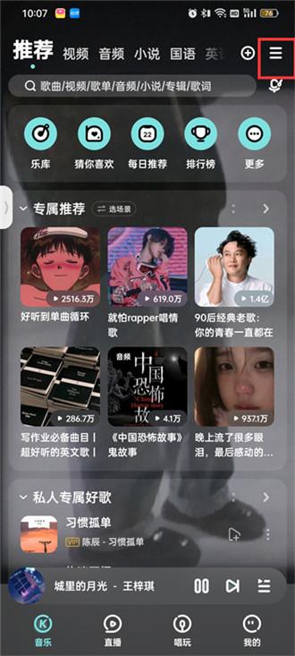 1.首先打开酷狗音乐软件,进入主页之后点击右上角的【三横】图标;