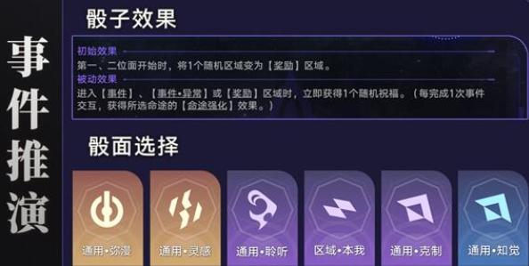 1、骰面选择:【[通用·弥漫]、[通用·灵感]、[通用·聆听]、[区域·本我]、[通用·克制]、[通用·知觉]】。多进事件拿祝福。