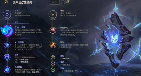 符文推荐:主系延续常规辅助的带法,巫术系的艾黎+法力流系带+超然,这是能提高自己辅助作用的同时进一步缩减冷却时间;副系为精密系的气定神闲+砍倒,通过气定神闲的效果,进而达到无限治疗的核心效果。