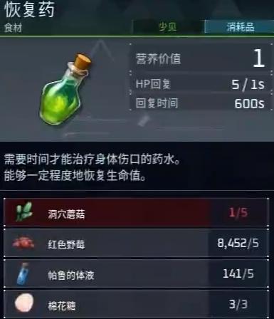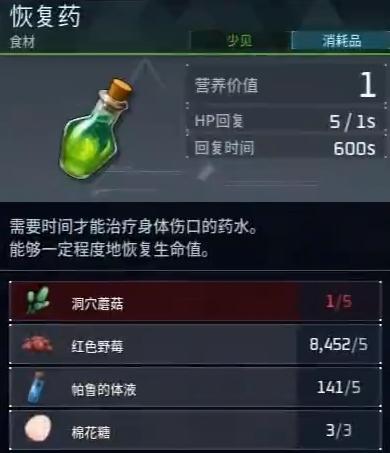答:使用洞穴蘑菇X5、红色野莓X5、帕鲁的体液X5、棉花糖X3即可制作恢复药