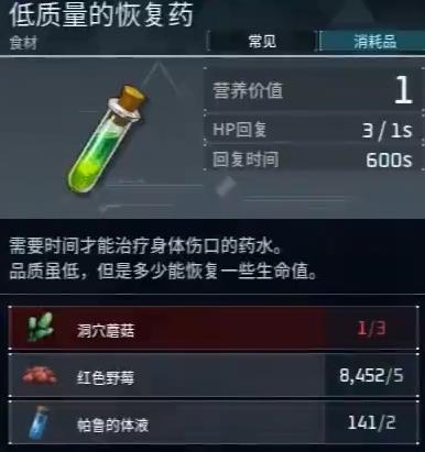 1、低质量的恢复药:洞穴蘑菇X3、红色野莓X5、帕鲁的体液X2