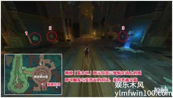 传送到「监舍区」下图所示位置的传送锚点,可以看到锚点两侧的墙上贴着三张纸,把它们全部撕掉即可触发与莫普瓦的对话,获得普通的宝箱。