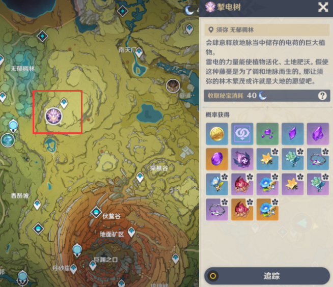 须弥地图右上角的世界Boss[掣电树]掉落,一次40树脂。