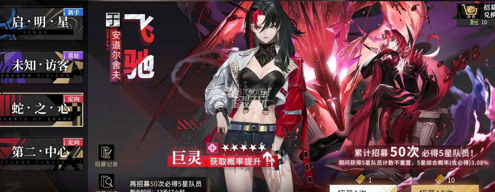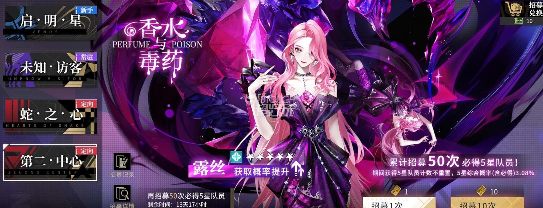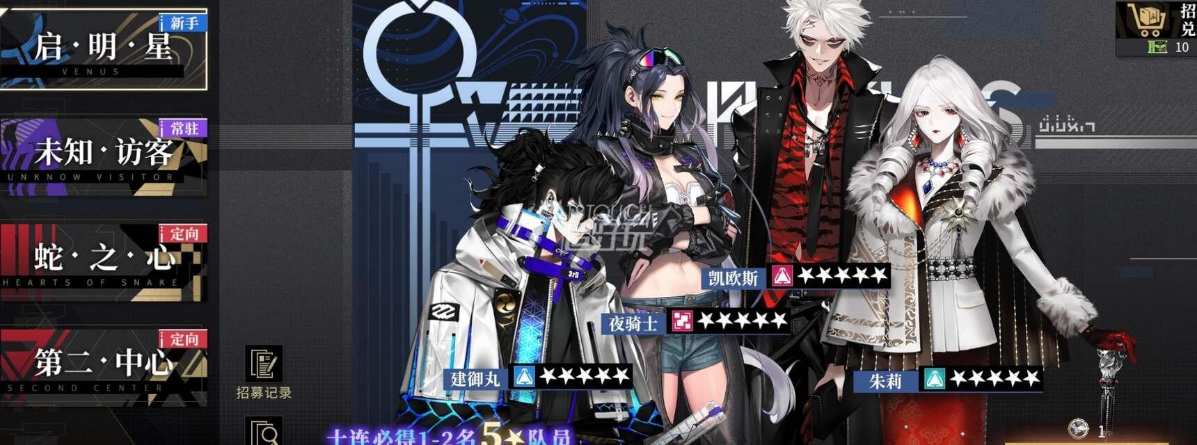 主线关卡0-6后开启,只能抽取一次十连,必定获得1-2个五星的角色,角色的抽取优先级为:夜骑士、朱莉、凯欧斯/建御丸;