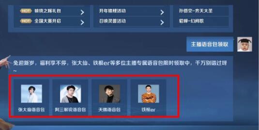 王者荣耀主播语音包如何领取?王者荣耀是有推出很多主播语音包的,平时看视频比较多的玩家会知道,很多平台上都汇聚着一些高人气的王者荣耀主播,游戏专门为他们设计了语音包,获取到后可以直接使用,对局中直接就能收听到语音包的效果如何了。很多隐藏活动的都可以从妲己页面中获取,这次也不例外,找寻到相应页面后发送领取文字即可,像是小编很喜欢张大仙的语音包,直接获取后就能在游戏对局中听到大仙本人的声音了,而且感觉每一局都能上大分的样子呢。不知道怎么领取主播语音包的话,快快点击进来看看吧。